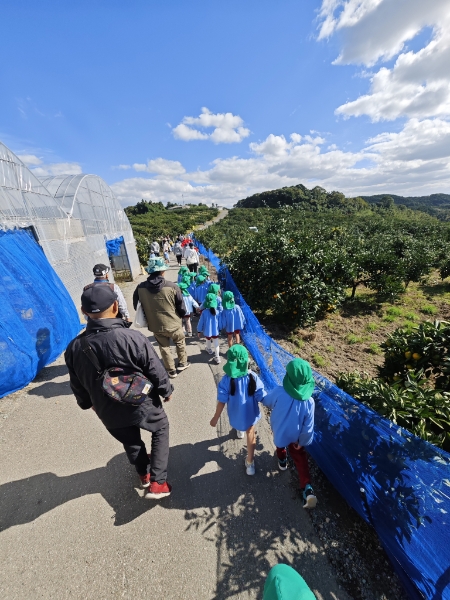 ポカポカと暖かいお出かけ日和の中、みかん園に着くと、木に実っているたくさんのみかんに大興奮の子どもたち♪美味しそうなオレンジ色のみかんをじっくり選び、ハサミを使って袋いっぱいに収穫していきました。時には、坂道をコロコロ…と転がって逃げようとするみかんもありましたが、子ども達には敵いません( ˊᵕˋ ;)