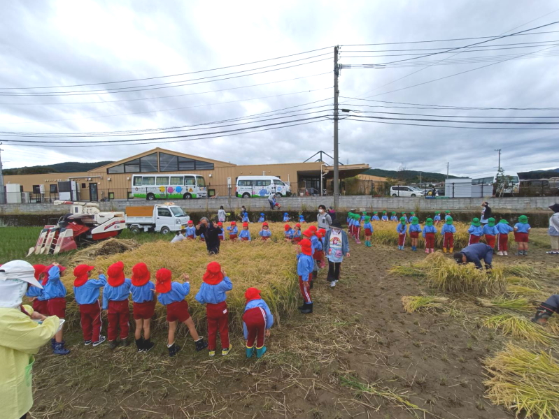 幼稚園の隣の田んぼで、年少と年中の稲刈りをおこなわれました。子どもたちははさみを持って稲を一本一本切って収穫しました。年少の握力では根本からはさみで切るのがすごく大変そうでしたが、先生たちの助けを借りながら頑張って刈り取っていました。