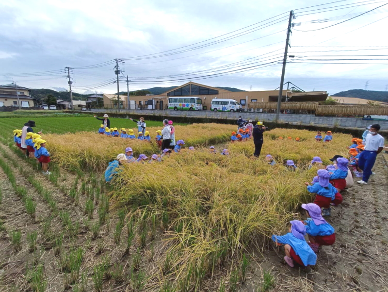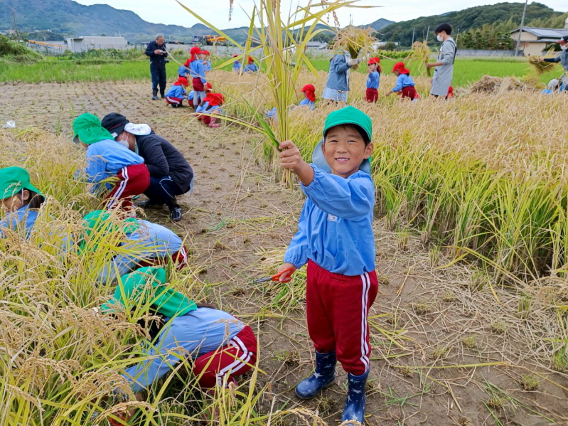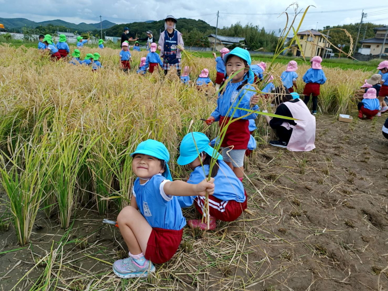 悪天候にて延期していました、年長の稲刈りがおこなわれました。年少・年中だと稲を切るのがなかなか大変でしたが、年長さんになると力もあって、はさみで稲をサクサク切っていました。おともだちとどちらがたくさん刈れるか競争したりして楽しくおこなっていました。