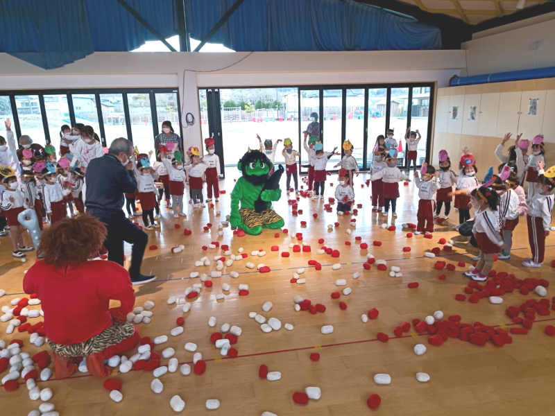節分の豆まきをおこないました。ホールに鬼さんがやってきて、豆の代わりに赤白玉で鬼さんを退治しました。鬼は~そと、福は~うち♪みんなの赤白玉攻撃に観念した鬼さんは降参して、もう悪さしないと、いい鬼さんになって帰っていきました。