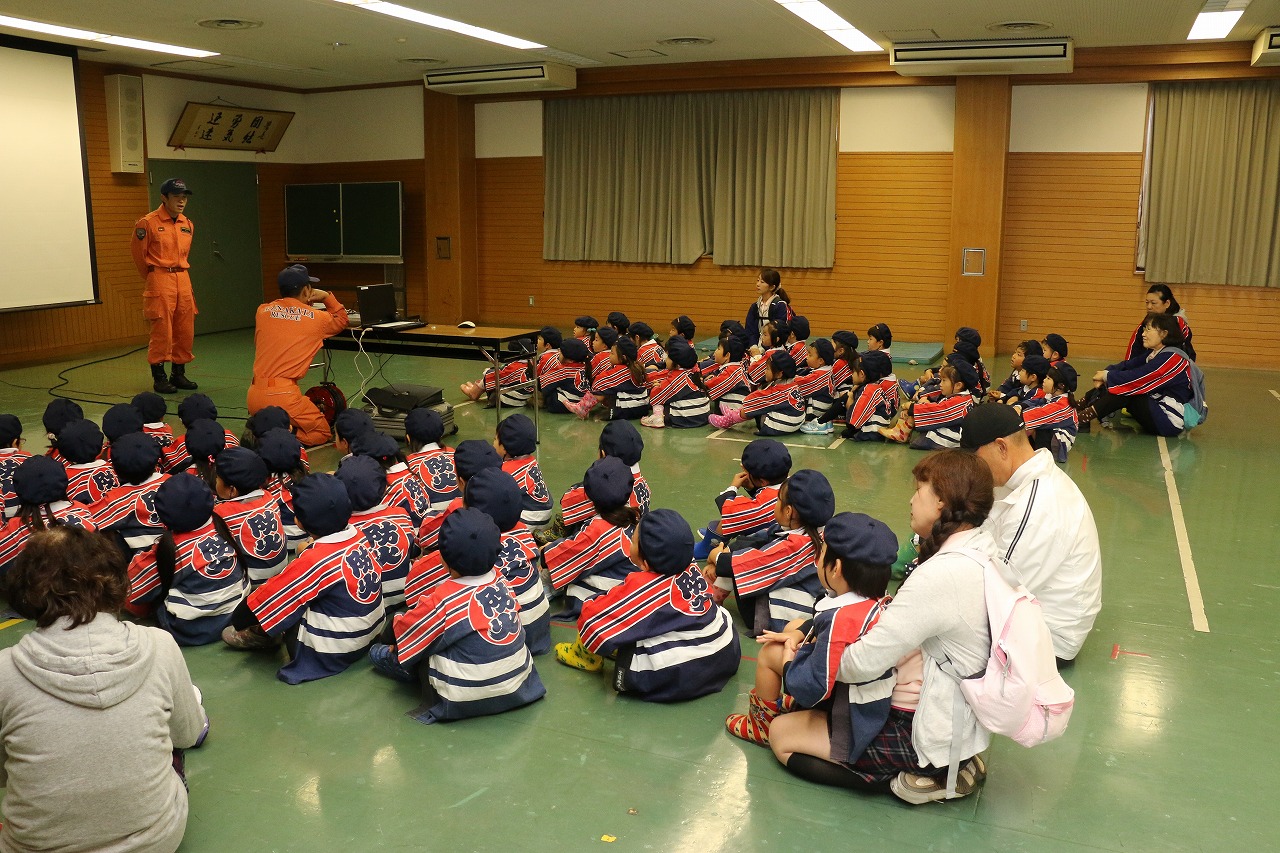消防隊員の方々が、たくさん消防車のお話をしてくれて、子ども達みんなも真剣にお話を聞いていました。