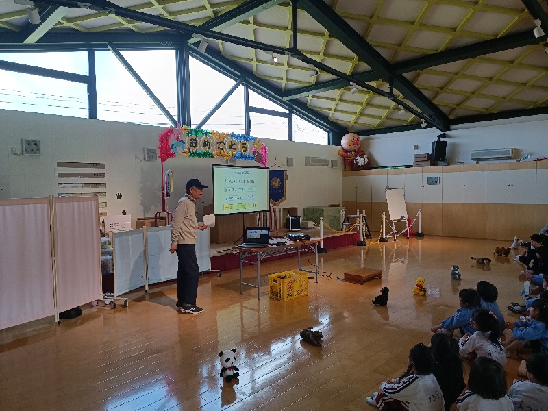 宗像警察署と交通安全協会の方を招いて交通安全教室を行いました。動物の絵や大きな顔の絵を使って、子どもたちが楽しく学べるように工夫して教えてくださいました。また、実際の信号機の部品で青、黄、赤の信号の意味を教えてもらいました。